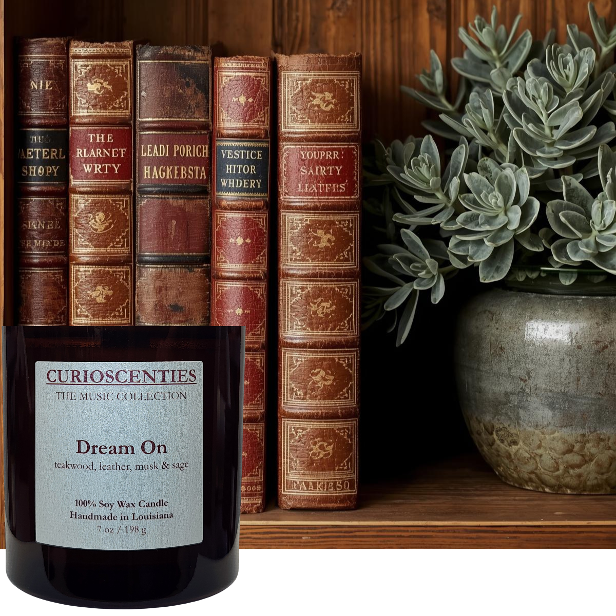 Inspiration: Dream On. Aerosmith. "Half my life's in books' written pages, lived and learned from fools and from sages". The masculine scent of antique leather-bound books on old wooden bookshelves combined with sage.